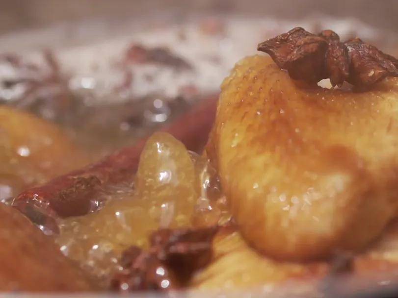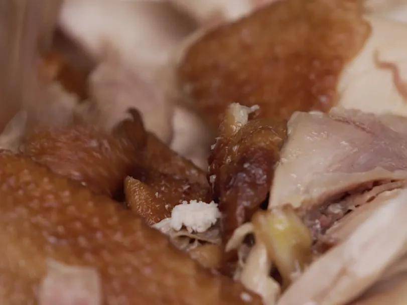海记烧鸡以生长一年半左右的鸡味原料,经过腌制、着色、风干、炸制、卤制等数道工序,才能制作而成。海记烧鸡的料油、老汤等都是祖传秘方,因此制作的烧鸡独具风味,除了花椒、大料、小茴香等常用香料,还有荜拨、良姜、肉桂、丁香、白芷等,每一味香料的配比都是传承多年的智慧结晶。