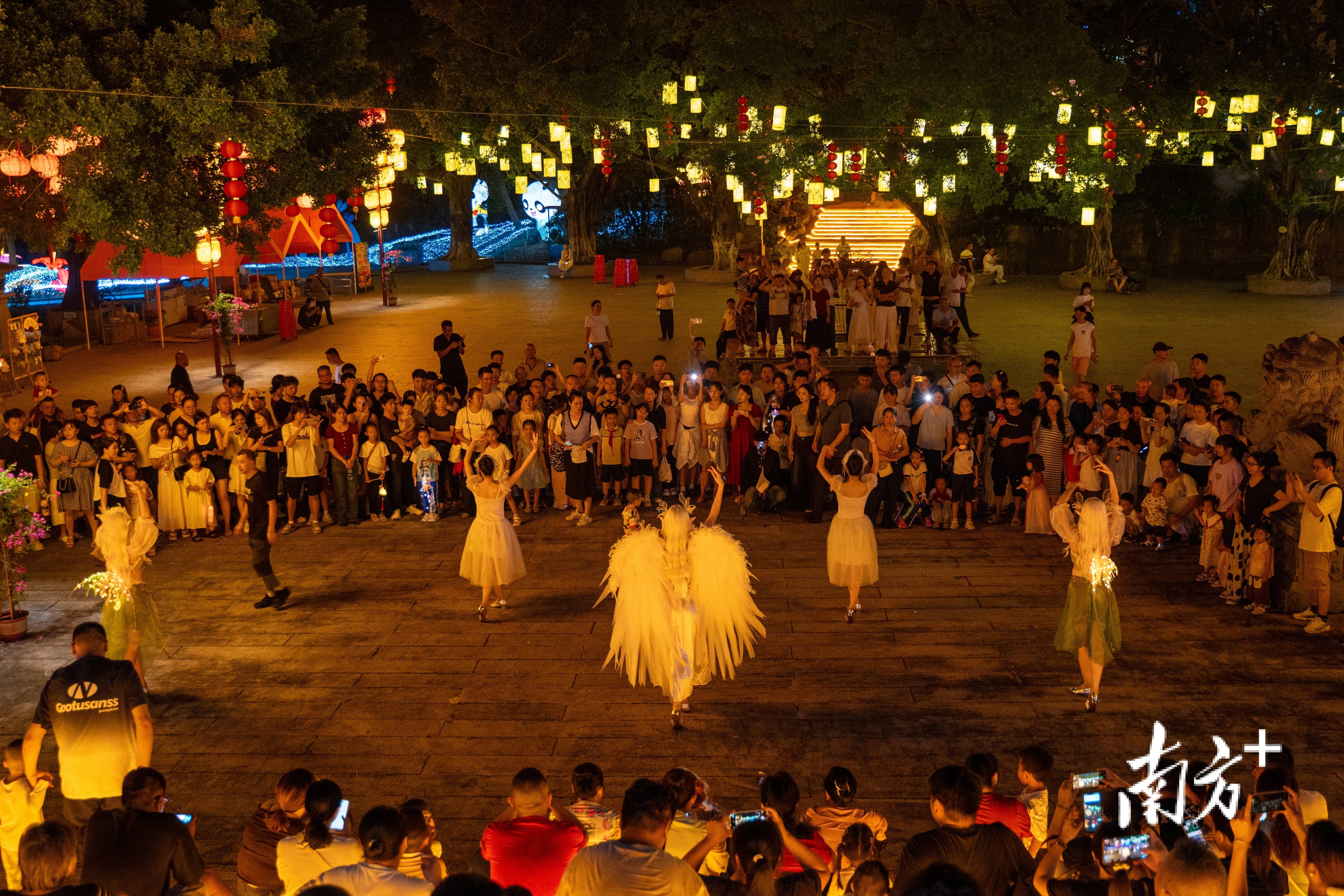 夜幕降临,一盏盏造型各异的精巧花灯把三水森林公园孔圣园装点一新,游客穿行其间宛如进入奇幻森林。国庆期间,三水森林公园首次推出“千灯之夜”夜游项目,举行了花船表演、篝火晚会、流星雨瀑布、非遗火壶秀和打铁花等活动,城区生态绿芯焕新为灯光璀璨的“不夜城”,为游客奉上别开生面的视觉盛宴。