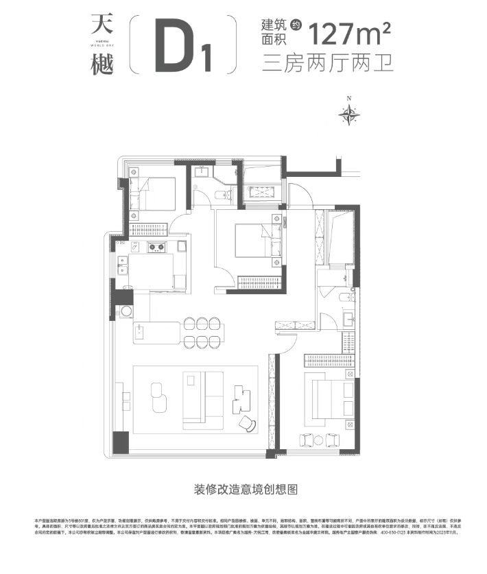 108㎡的改善三居户型,空间阔绰舒适,专为改善型家庭打造,能够满足全家人畅享便捷都市生活的需求。户型采用南北通透设计,空气对流顺畅,室内采光充足,客厅开间达到 4.3 米,空间阔绰大气,搭配大尺寸的观景窗户,将室外的园林美景引入室内,营造出开阔明亮的居住氛围。