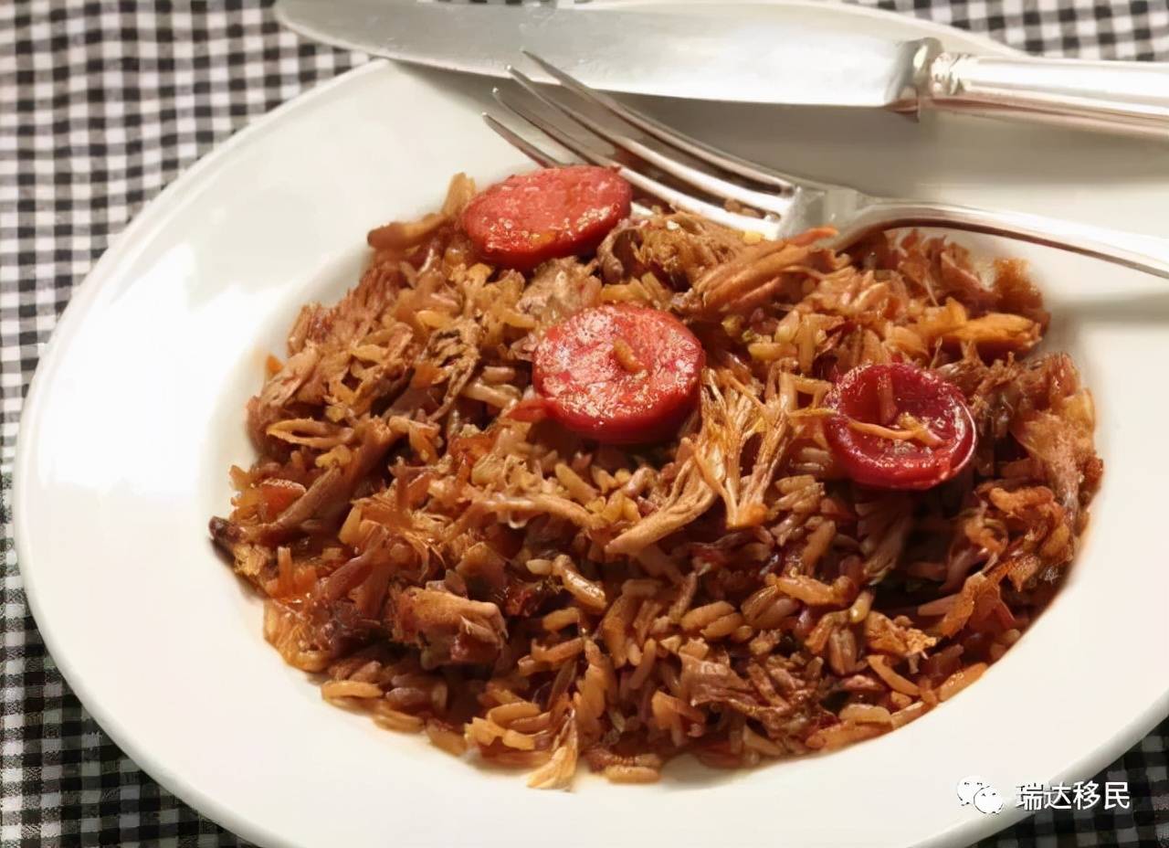 这是一道制作工艺十分复杂、讲究的美食。不裹面衣,将精选的全鸭炸成香喷喷的金黄色后,再浸入由芹菜、洋葱、生姜、葱、大蒜等调味蔬菜与红酒、香辛料完美结合而成的特制酱汁中小火慢煮。等待入味后,再加入米饭与肉一同煸炒收汁、出锅。装盘时,还要在面上铺好特质香肠加以点缀,最后放进烤箱烘烤才算完成。