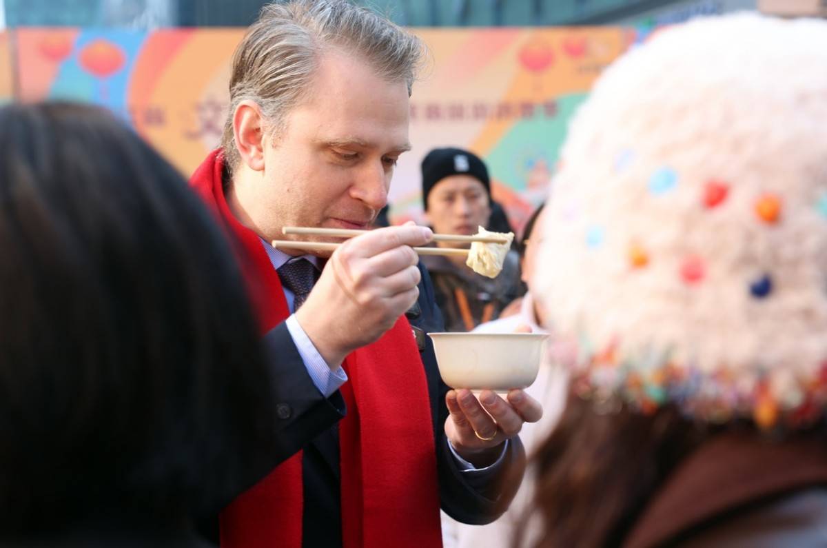 在热闹的美食市集上,奥地利维也纳新城政府发言人塞巴斯坦·科瓦奇被香格里拉酒店的“鄞县老三鲜”深深吸引。冬日里一碗热腾腾的“老三鲜”下肚,不禁让他连声夸赞“好吃”。