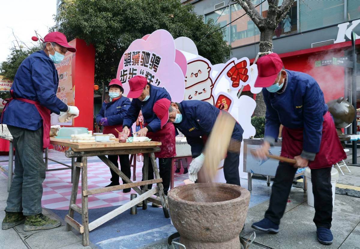 在“ENJOY鄞州”年味体验区,传统年俗的沉浸式体验成为另一大亮点。鄞州文旅复原了宁波非遗“踩咸齑”和古法打年糕的场景,邀请市民亲身参与。脚踩盐坛的“硬核”腌制技艺与捶打米团时飞扬的米香,让深藏于民俗中的年味变得可触摸、可体验,唤醒了许多人的童年记忆。