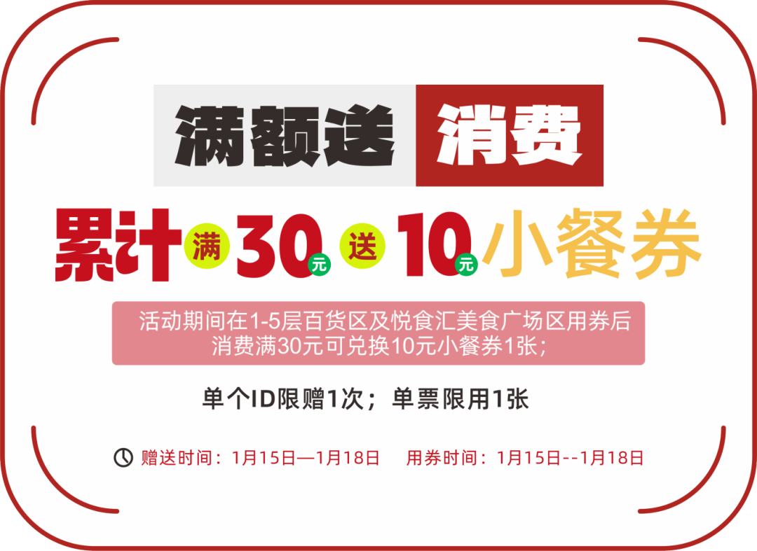 1月15日-1月18日,在五堰商场1-5层百货区及悦食汇美食广场区,用券后消费满30元,还可额外兑换一张10元悦食券,越吃越优惠!