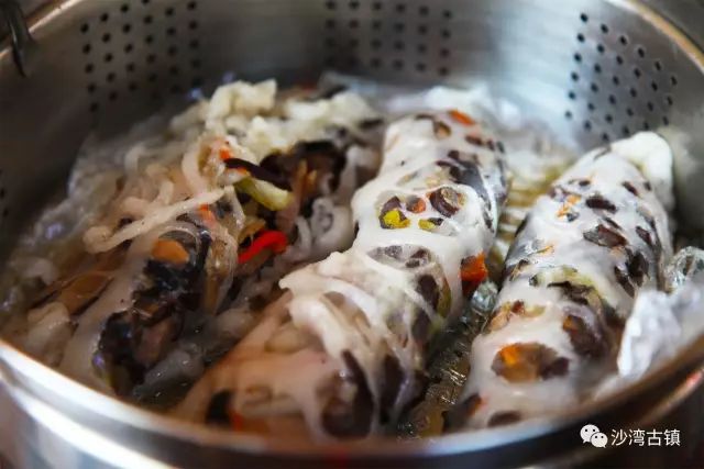 网油春卷是沙湾的特色小吃。它的外皮是网状的,里面铺上肉沫、香菇、葱头、马蹄做馅,卷好后油炸,出锅后用刀切成小段,色泽黄亮,入口松脆。