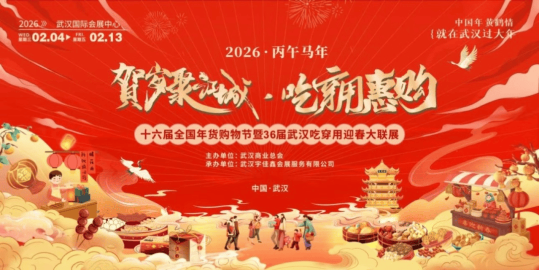 湖北省商务厅“购在中国”武汉专场核心分会场,30+专业市场、100个主题展位,上千种源头好物;涵盖本土老字号、进口商品、生鲜粮油等,可叠加“乐购湖北”消费补贴享受折上折;设置非遗体验区(打糍粑、摊豆丝等)、百姓大舞台(歌舞戏曲展演),还有5.20km寻宝跑道健康跑,完赛可获定制奖牌及年货礼包。