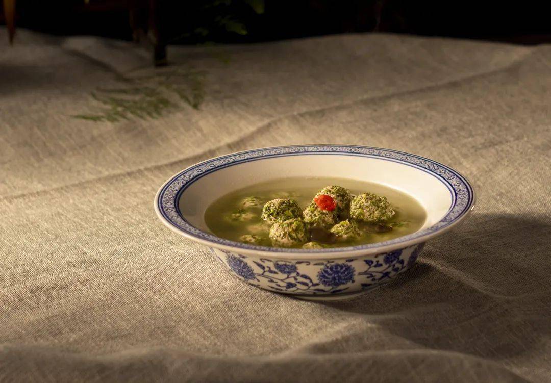 古有诗云:盘装荠菜迎春饼,瓶插梅花带雪枝。在绩溪,新春之前采摘荠菜作菜点,以期待春之将临。荠菜圆子以荠菜、豆腐、香菇、火腿、虾米等多种食材为原料,荠菜清香、馅料滋润鲜美。将猪五花肉剁成末,荠菜洗净用沸水烫3分钟,挤去水分,剁碎;香菇、火腿、虾米、大蒜、姜切碎,打入鸡蛋,所有食材一同拌匀,做成圆子;锅中冷水煮沸后下入荠菜圆子,待圆子浮起时捞出即可。