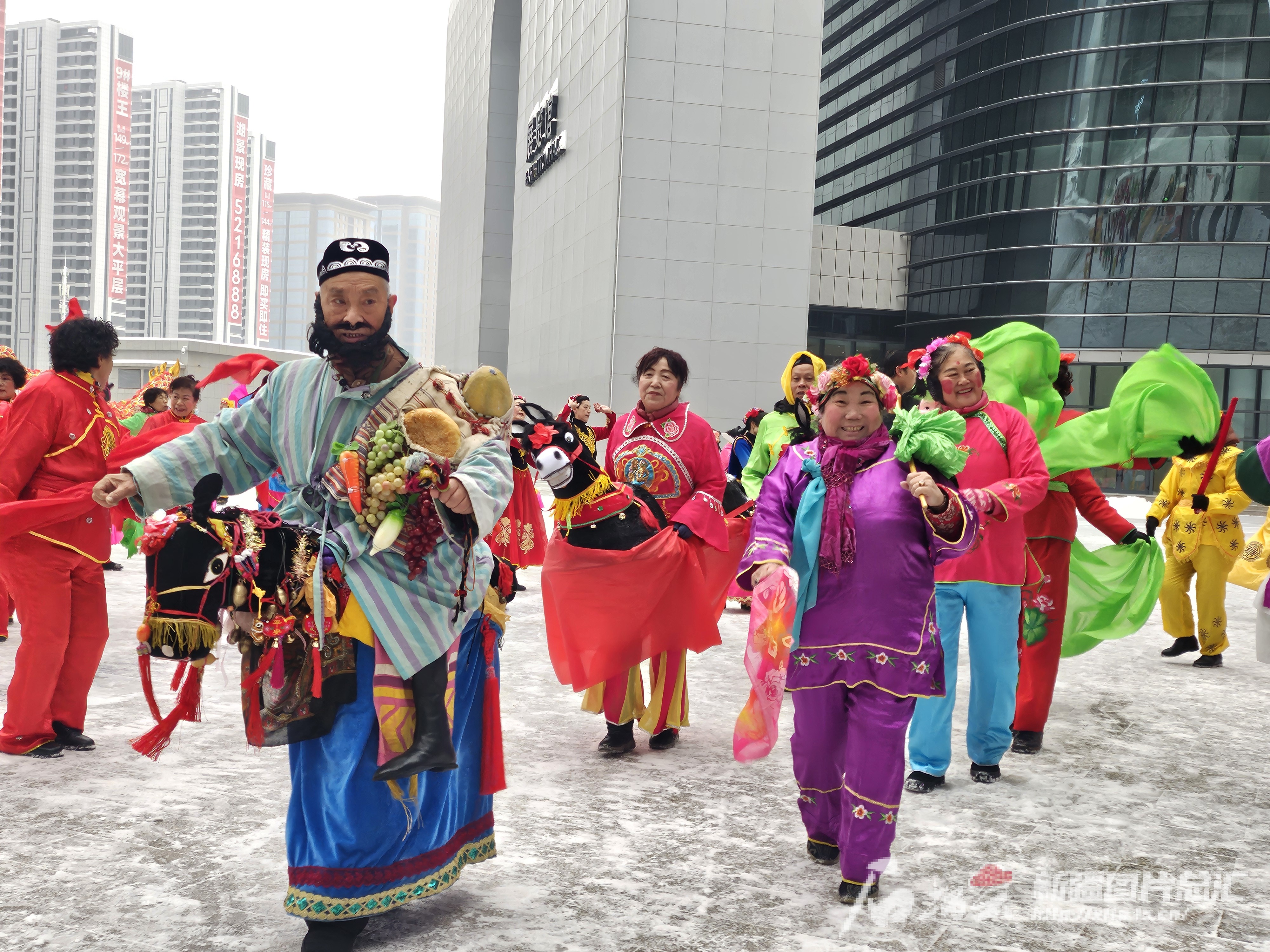 1月9日,乌鲁木齐文化中心,参加“打起手鼓舞起龙 乌鲁木齐社火迎新春”活动的社火队伍在彩排预演。石榴云/新疆日报记者 郭倩摄
