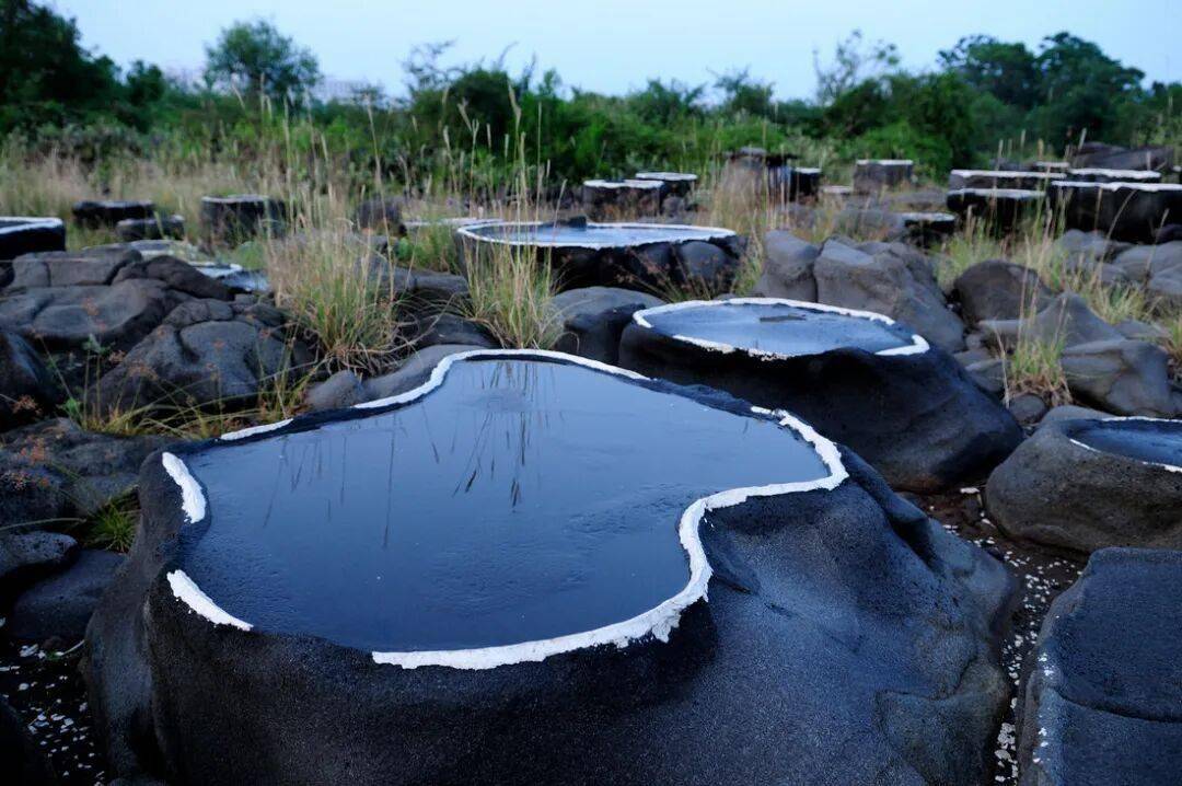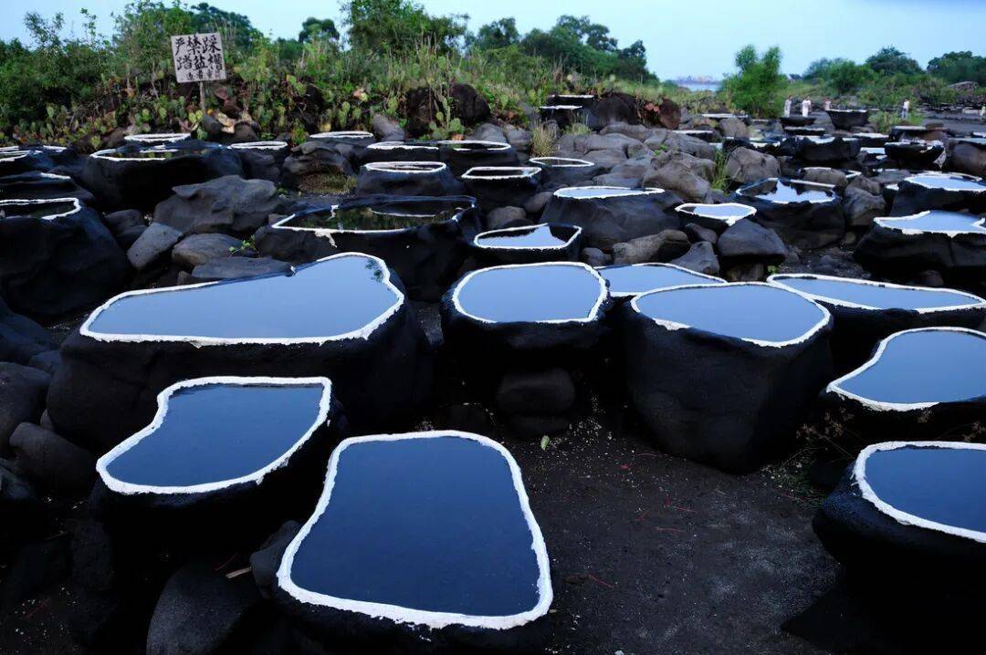 盐工们会收集富含盐分的海滩泥沙,通过浇灌海水过滤,制成高浓度的卤水,将卤水倒入由天然火山岩石凿成的砚式石槽中。这些石槽大小不一,总数超过6800个,错落有致地分布在海边,本身就是一道壮观的风景,依靠海南强烈的阳光和高温进行暴晒,水分蒸发后,卤水便结晶成盐。这样生产出的海盐纯天然、颗粒大。