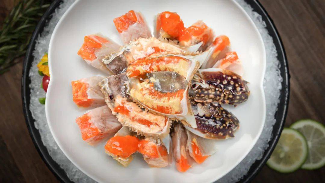 取出蟹壳,把呛蟹切成块,每一块有肉有膏,有白有红,沿盘边摆成一圈,盖上完整的大蟹壳,一道呛蟹摆盘就完成了。