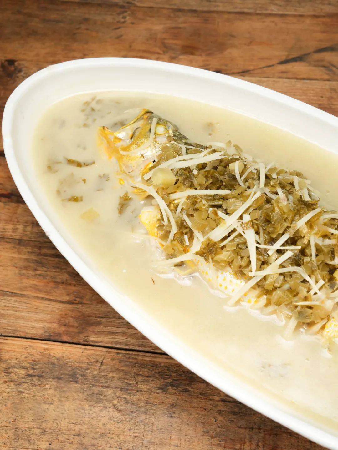 选用新鲜的大黄鱼,冷水下锅开煮,直至大黄鱼躺在乳白色的汤中,鲜嫩的皮肉在水中绽开,再放入腌制的咸菜,辅以笋丝。片刻,鲜嫩的黄鱼于蒸腾的热气和色泽深绿的咸菜中展露特有的金黄色,鲜味迫不及待地飘出来,直抵鼻尖。