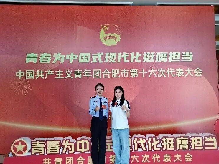 7月10日,中国青年团合肥市第十六次代表大会盛大开幕,合肥一六八中学优秀团员代表魏欣桐参会,并偶遇了同样毕业于合肥一六八中学的学姐肖厚容(2017届21班毕业生,曾获《人民日报》点赞的铁骑女警),留下一张合影,展现了两份不同岗位的青春担当。