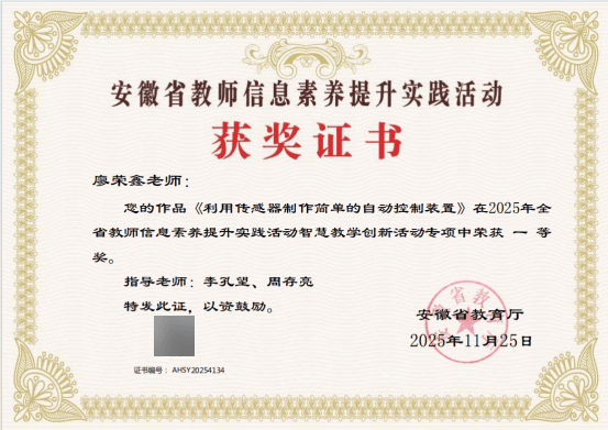 11月,廖荣鑫荣获安徽省教师信息素养提升实践活动智慧教学创新活动一等奖;刘宜萍、吕旁顺2位老师3节课例入选人工智能全国优秀案例。