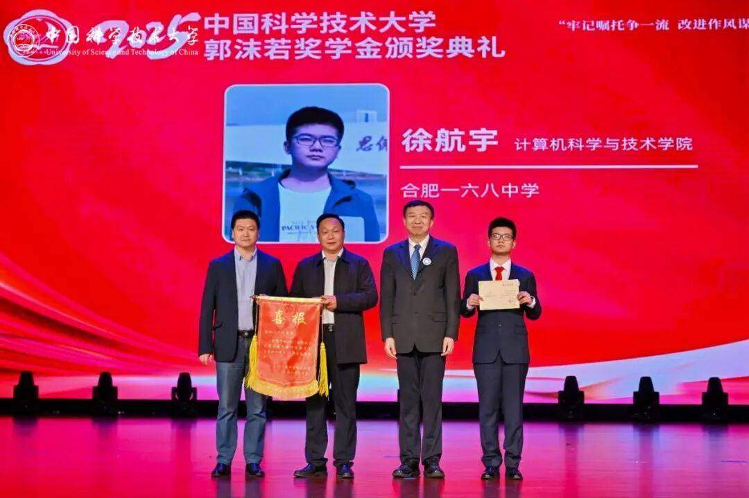 4月25日,中国科学技术大学举办2024-2025学年“郭沫若奖学金”颁奖典礼,一六八中学校友徐航宇(2021届毕业生)喜获郭奖,中科大党委书记舒歌群向合肥一六八中学校长罗在兵赠送喜报。