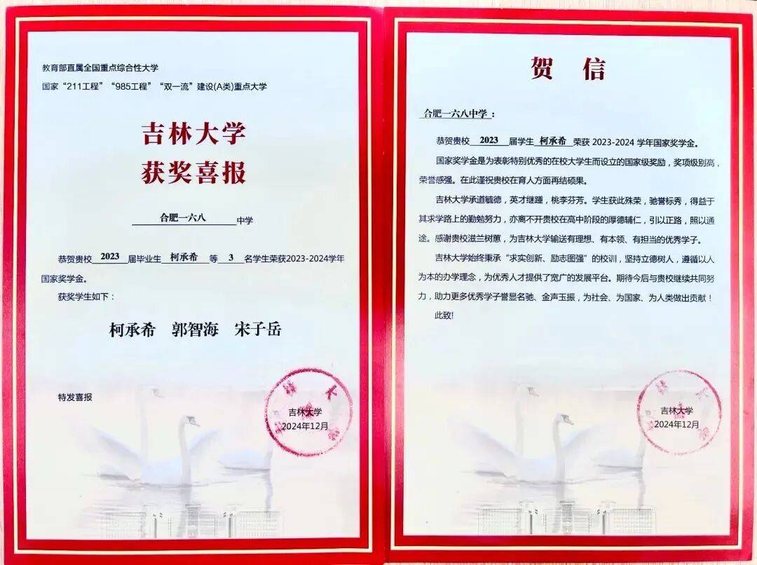1月,收到来自吉林大学的贺信,校友柯承希、郭智海、宋子岳(2023届毕业生)在吉林大学学习期间表现出色,共同荣获2023-2024学年国家奖学金。