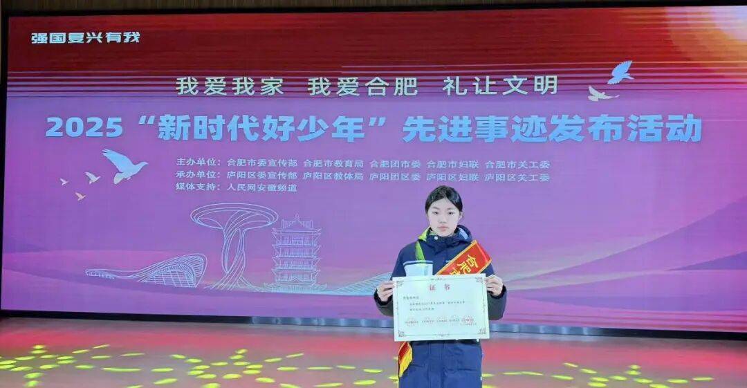 12月,高二(1)班何睿欣同学(班主任:吴晓莉)光荣入选合肥市“新时代好少年”(合肥市高中组仅4人),实现学校在该项荣誉上的首次蝉联。
