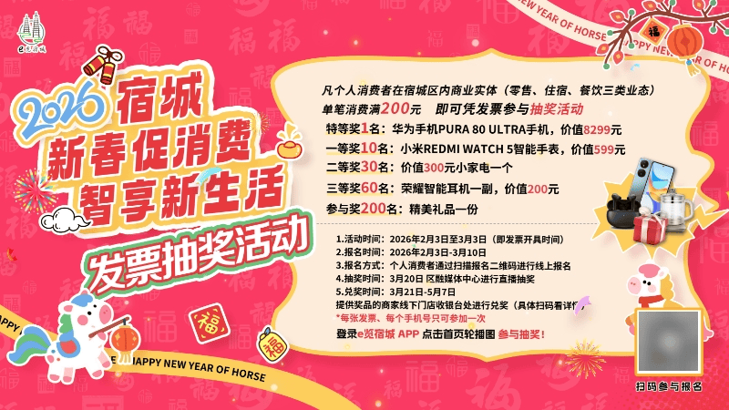 宿城区创新推出“智享新生活”发票抽奖活动,个人消费者在零售、住宿、餐饮三类实体单笔消费满200元并开具发票,即可抽取手机、耳机、小家电等丰厚奖品,让普通发票变身“新年福票”。