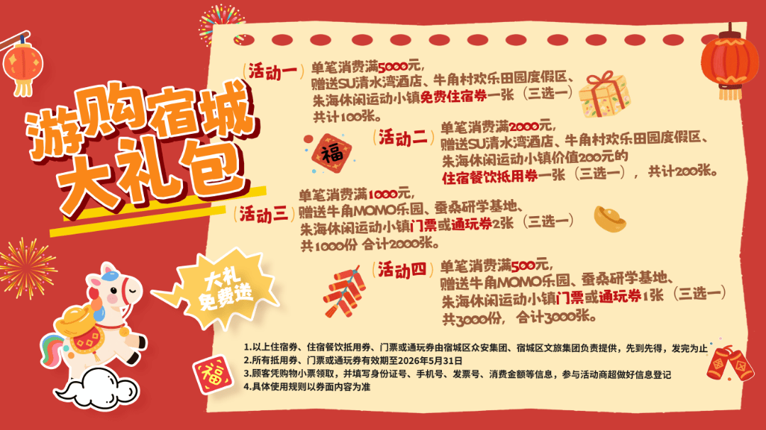 各大商圈提前开启“马年限定”模式,以“马”为媒、以“潮”为引,打造集购物、餐饮、娱乐、文化于一体的沉浸式消费新场景。宿城吾悦广场“以梦为马”串联年俗非遗大集、敦煌鼓舞、五路财神游年、全家照相馆等50余场活动,消费满额即赠小马挂件、黄金手机贴。金鹰购物中心非遗打铁花、飞天凤凰,浪漫拥抱大赛赢取普拉达唇膏。中央商场“年聚万家·爱在中央”黄金珠宝满万减百、服饰满减、数码购机补贴。宝龙广场设宋式积分市集,马年日历、福马玩偶等文创礼品凭积分兑换……