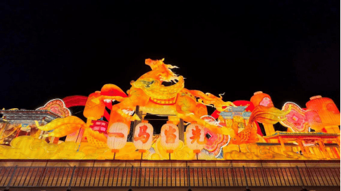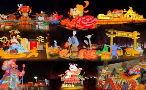 59组主题灯组中,10米以上大型灯组数量创历年之最,以杨柳青年画为灵魂,融合运河、精武、赶大营等元素。《一马当先》骏马奔腾气势如虹,《津韵剪影・生肖漫游》剪纸生肖憨态可掬,《仕女游春图》将平面年画化为立体画卷,《精武文化》灯组重现霍元甲练武名场面……