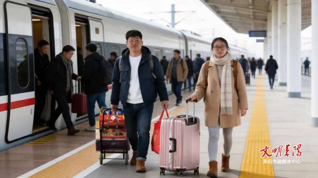 耒阳火车站出站口人流如织。拖着行李箱、提着大包小包的旅客步履匆匆,脸上洋溢着回家的喜悦。在广州从事装修多年的周先生刚走出站,便见到前来迎接的家人。他一手推行李箱,一手拎着两大袋广式腊味和莲蓉糕点。“在广州忙活一年,还算顺利。带点本地特产,给家里人尝个新鲜。”他笑着将零食塞到孩子手中,孩子捧着果干,笑得眼睛眯成了缝。