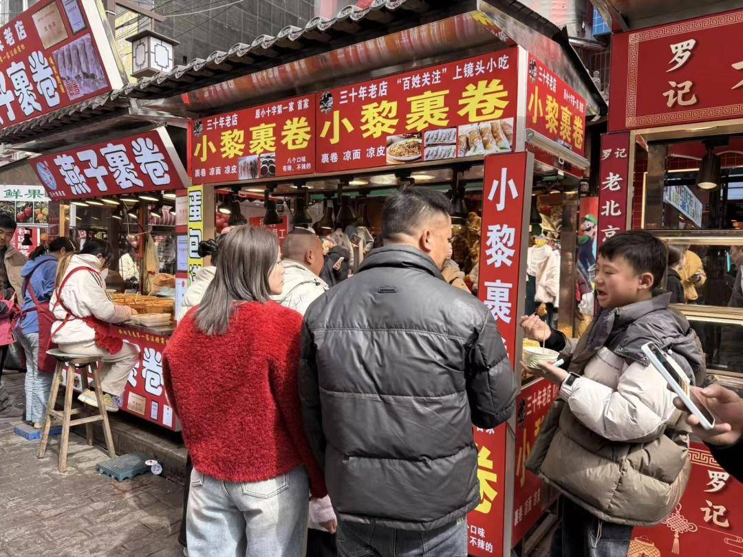 不仅是烧饼摊,烤小肠、油炸粑、裹卷等特色摊位前同样人气旺盛。多位商户反映,今年春节客流明显高于往年,夜晚街区依旧热闹,外地游客占比大幅提升,不少游客专程为品尝本地风味而来。