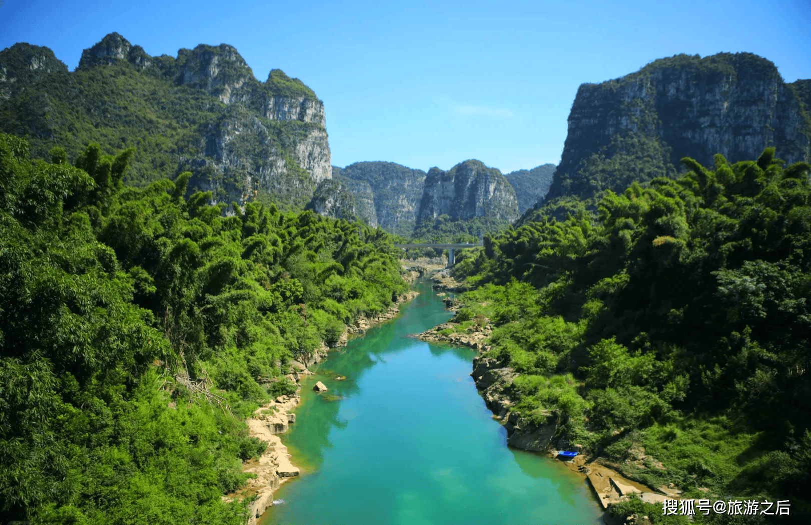 泛舟浩坤湖:湖水蓝得像宝石,四周被喀斯特山峰环绕,有“广西小喀纳斯”之称,静谧出片。