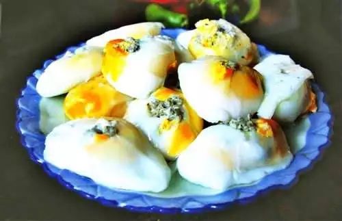 又称灌蛋,顺昌美食。制作精细讲究,打一新鲜的鸭蛋在水里,再讲剁好的馅用尖筷一点一点的塞进蛋黄里,适量为止,之后放窝内温火二十分钟,熟后即可。煮好的“灌蛋”外表晶莹如雪,白里透黄,在青葱点缀下色彩鲜艳,令人顿生食欲。细品“灌蛋”,外皮嫩滑,蛋黄与肉菇山鲜味道交融。“灌蛋”在顺昌有着“银包金”的称号,有着团团圆圆、财源广进的美好寓意。